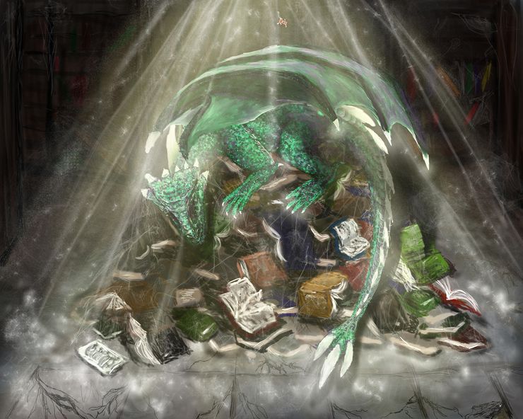 Anyway, back to the painting. This was actually my first time painting a dragon, hence the reason I took so long, and I'm very pleased with how it's turned out! I didn't create any rough pencil sketch beforehand, and just freehand painted it in Corel Painter with my graphics tablet. I started with just laying down values of tones and the general forms that would, eventually, make up the tile floor and the background bookshelves and then starting roughing in the pile of books building it up slowly and, finally, adding in more distinct details so that what it would read clearly. Next came adding in the actual dragon, again, just roughly at first, before refining the shape and details. Finally, the shadows and lighting were added and everything got the last bits of cleaning up and extra finishing details until it got to where I decided it was 'finished' and any further fussing with it was liable to mess it up rather than enhance.