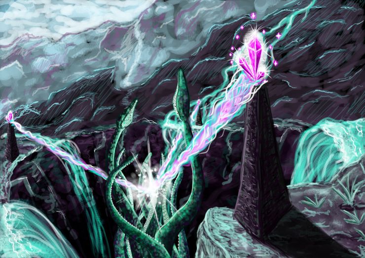 It's finished! I put the finishing touches on it over the weekend. I had absolutely no plan for this painting in the beginning. I just knew that I wanted to use some of the brushes that I've been working on and, after looking at several other digital paintings for inspiration, I just picked a couple of colours and had at it. The more I painted, the more it changed and a concept started to come together. I had to change things up a bit when I realized that the forefront row of mountains were too oversized for the original perspective I'd been aiming for. I'd vaguely been aiming for more of an epic, fantasy landscape viewed from a distance, but, because of the scale of those mountains, it made it look like the viewer was actually in those mountains rather than looking at them from a ways off. With that in mind, I decided to make the foreground into a giant pit with a bit of a cliff face overlook. Next came the waterfalls and the sentinel columns with magical crystals. I was just about finished, but then the I thought it would be a great idea to put a creature coming out of the pit and make the columns a protective defense against it. Thus, you end up with a kraken in the middle of mountain range! Because, why not? It's the very last place you'd expect such a creature which is what made me love the idea.